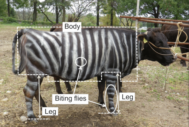 Группа из 11 японских ученых получила награду за изучение того, могут ли коровы, окрашенные в полоску зебры, избежать укусов слепней. Известно, что слепни почти не беспокоят зебр. Ученые нарисовали белые полосы шести японским черным коровам.